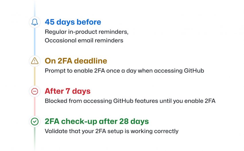 С 13 марта на сервисе действует требование использовать 2FA для защиты аккаунтов: сначала оно распространится на несколько групп разработчиков, а до конца 2023 года станет обязательным для всех активных пользователей GitHub.