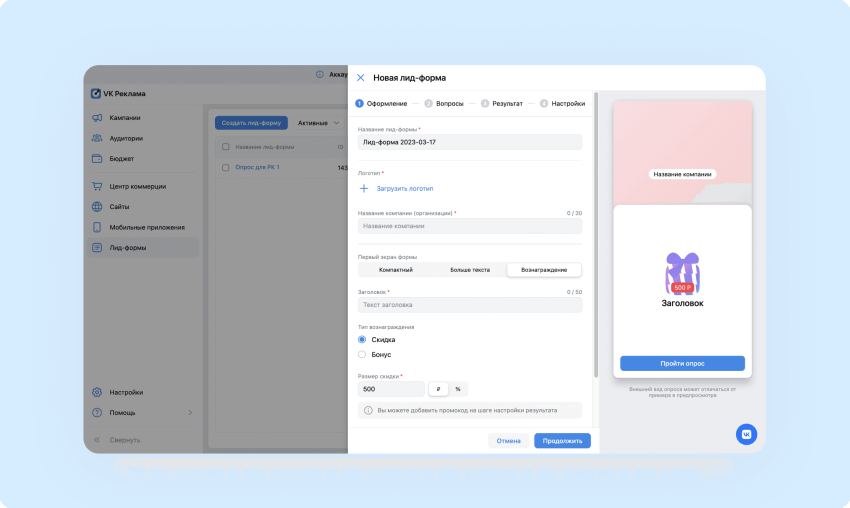 Лид-формы в сервисе VK Реклама – это инструмент продвижения, который позволяет получить заявки или заказы клиентов и проанализировать интересы аудитории. Теперь рекламодатели смогут использовать скидки и бонусы в лид-формах, сообщается в блоге платформы.
