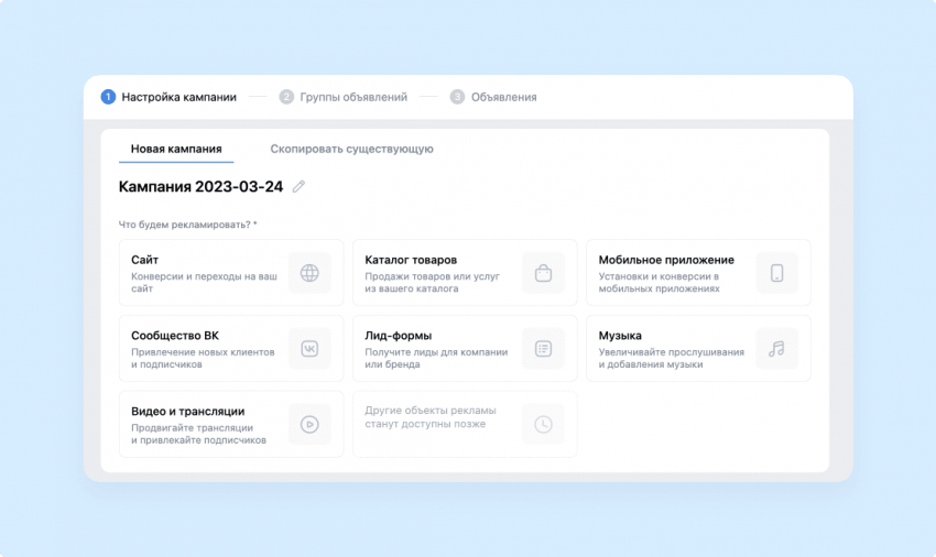 Для начала продвижения стоит зарегистрироваться в рекламном кабинете через учетную запись VK ID. После в сервисе автоматически появится информация о загруженных в сообщество аудиозаписях. В одном объявлении можно продвигать как отдельные композиции, прикрепляя при этом за раз до 10 треков, так и целые плейлисты. Запустить кампанию нового типа можно следующим способом: