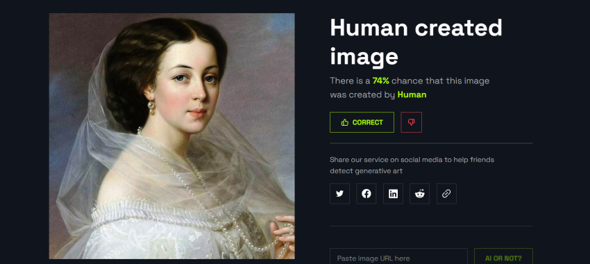 Стартап Optic разработал новый сервис AI or Not, который позволит определить, создано изображение человеком или нейросетью. Правда, в данный момент AI or Not дает не всегда корректные ответы, а иногда затрудняется с выбором и выдает сообщение «Sorry, but in this case we can’t really say if it’s AI or Not».