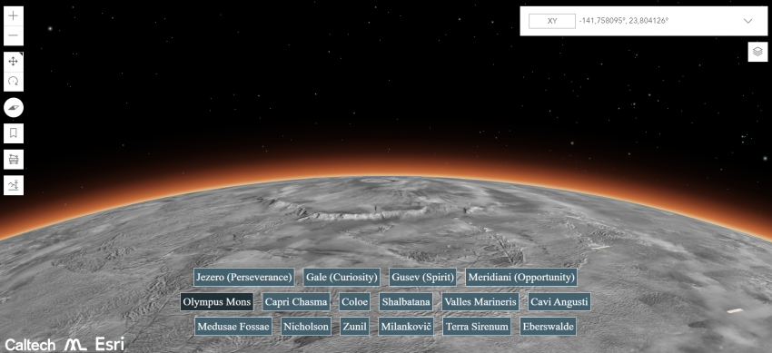 При этом посмотреть карту может каждый желающий: она достаточно легко масштабируется, а внизу экрана есть кнопки, чтобы быстро перейти к интересующим объектам Марса, например, к горе Олимп или кратеру Езеро. Карта охватывает 99,5% поверхности планеты.