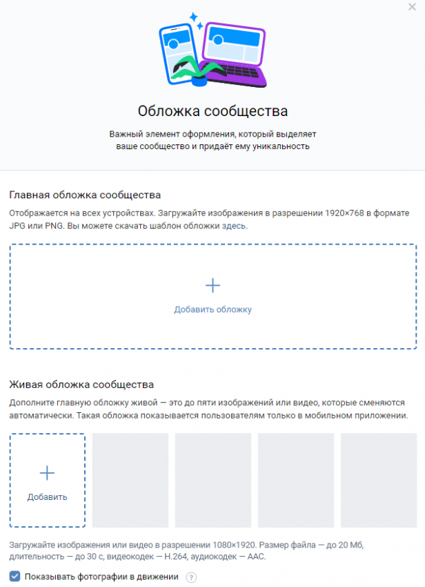 Загрузите обложку сообщества, чтобы сделать его более узнаваемым. В качестве обложки можно использовать файл в формате JPG или PNG с изображением товара и надписями: названием магазина и товаров, вашими контактами, информацией об акциях.