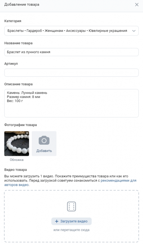 - «Видео товара» — вы можете загрузить 1 видео. В ролике покажите преимущества товара или продемонстрируйте, как его использовать.
