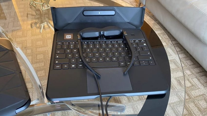 У ноутбука нет экрана в привычном смысле, однако AR-гарнитура (разрешение 1080p, частота обновления 72 Гц) позволяет проецировать собственный огромный изогнутый дисплей и обеспечивает 53-градусное поле зрения по диагонали. Также в гарнитуру встроены небольшие динамики. При этом виртуальный экран не закрывает обзор в нижней части, выглядит это так: