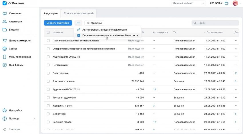 Ориентировочно, перенос будет длиться от минуты до нескольких часов – это зависит от объема аудиторий и их количества. После импорта аудитории появятся в VK Рекламе и их сразу можно будет использовать.