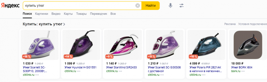 Объявления в Товарной галерее располагаются прямо под поисковой строкой – ранее туда попадали динамические объявления, созданные на основе фида, или объявления из Товарной кампании. Такая реклама содержит домен магазина, название, изображение и цену (со скидкой, при наличии) товара. По данным Яндекса, объявления из Товарной галереи приносят рекламодателям +14% дополнительных конверсий.