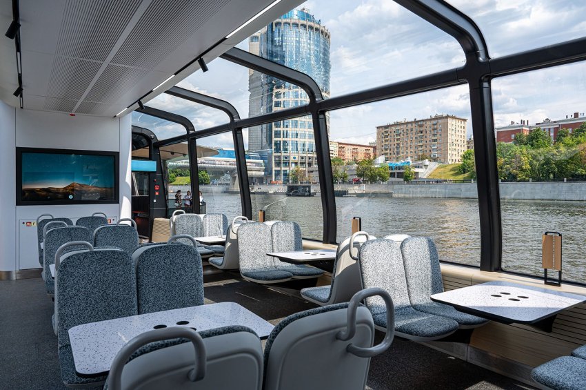 Всего запущено 8 электросудов, названных в честь столичных рек, каждое вмещает до 50 пассажиров. На судне есть информационные экраны, USB-зарядки и бесплатный Wi-Fi, а для самокатов и велосипедов предусмотрена парковка.
