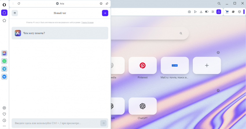 Первую версию браузера с ИИ Opera представила в апреле 2023 года, тогда только разработчики могли протестировать чат-бота и отправить отзывы компании. Сейчас же всем пользователям доступна работа с Aria, правда, потребуется учетная запись Opera: открыть чат можно на боковой панели. Вот так выглядит чат-бот: