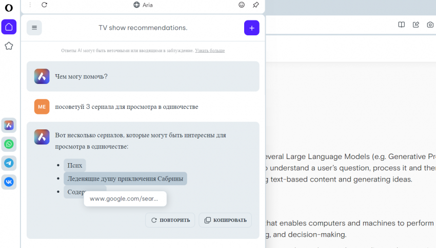 Нейросеть поможет искать информацию в интернете, создавать контент, отвечать на вопросы. В диалоговом окне есть предупреждение «Ответы AI могут быть неточными или вводящими в заблуждение» и ссылка на справку Opera, где подробнее рассказано, как функционирует нейросеть.