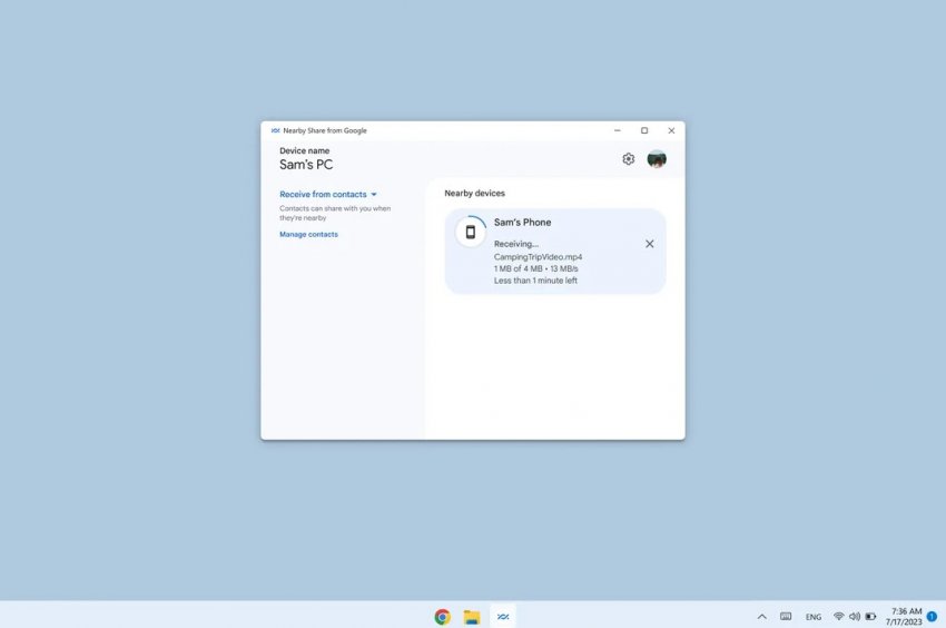 В блоге компании появилась новость о том, что приложение Nearby Share, упрощающее обмен файлами между ПК на Windows и Android-устройствами, официально запущено. С марта этого года пользователи могли опробовать бета-версию приложения.