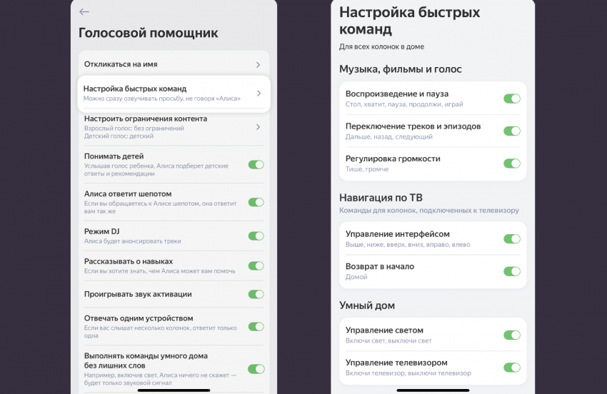 Сейчас доступно 20+ быстрых команд, включить и отключить их можно в настройках приложения «Дом с Алисой». Пользователи смогут управлять просмотром фильмов, регулировать плейлисты и громкость звучащей музыки, включать или отключать свет и ТВ.