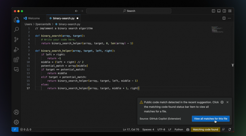 Как пишет Хабр, функцию внедрили после просьб пользователей Copilot. В исследовании, проведенном командой GitHub, выяснили, что предложенный код совпадает с публичным только в одном проценте случаев. При этом в новых проектах без контекста такие случаи встречаются чаще.