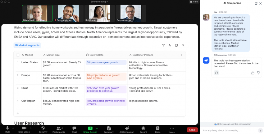 Zoom Docs – это модульное рабочее пространство на базе ИИ, созданное для совместного решения задач. В дополнение к функциям, которые есть у основных конкурентов – Google Docs и Microsoft Office 365, в Zoom Docs можно отслеживать проекты и создавать диаграммы или таблицы на основе собранных программой данных: все это позволит пользователям более эффективно сотрудничать.