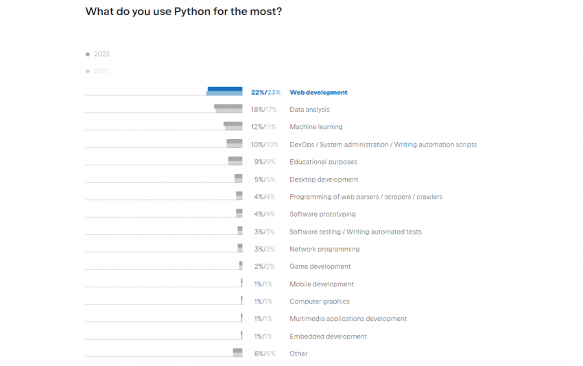 - Основная масса (22%) применяет Python в веб-разработке, также для анализа данных (18%), машинного обучения (12%) и системного администрирования (10%).
