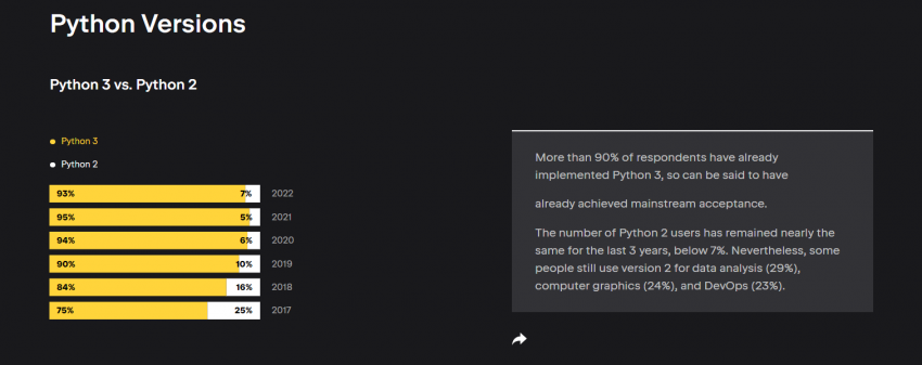 - Как пишет Хабр, 93% разработчиков перешли на Python 3, а старой версией (Python 2) пользуется всего 7%. По сравнению с прошлогодними показателями, доля большинства продолжает расти.