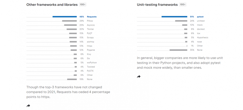 - Наиболее популярны у разработчиков библиотеки на Python Requests, Pillow, Asyncio, Tkinter, PyQT и Scrapy. Для тестирования же чаще используются фреймворки pytest, unittest и mock.