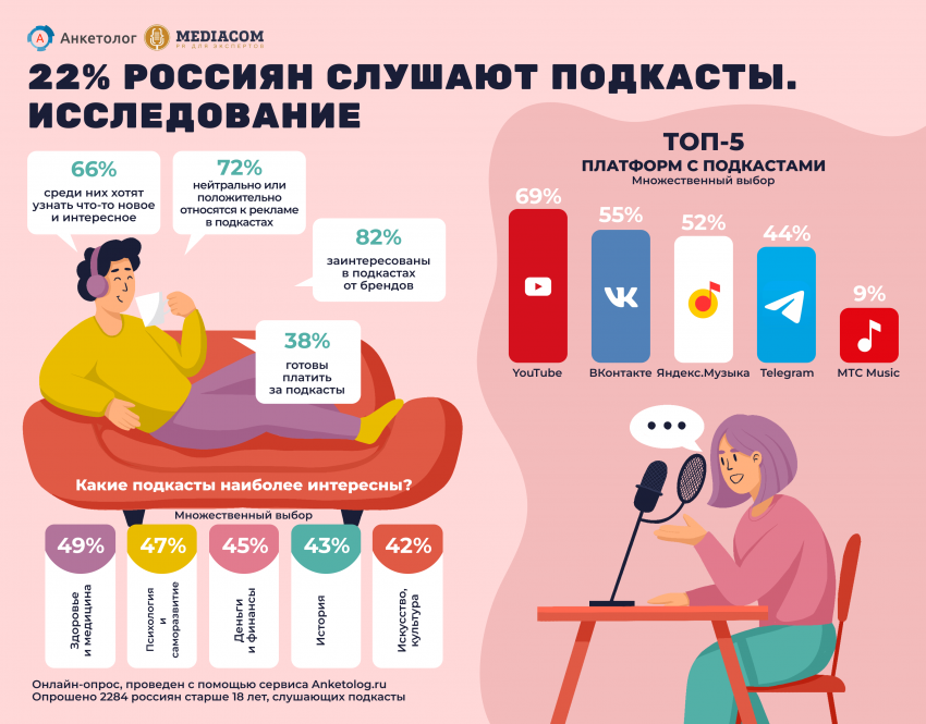 Анкетолог.ру совместно с PR-агентством Mediacom.Expert провели панельный опрос по востребованности подкастов среди россиян. Проходило исследование с 31 августа по 7 сентября, в нем приняло участие 2284 интернет-пользователя старше 18 лет, которые слушают подкасты. И, как сообщает компания, выборка отражала социально-демографические параметры населения РФ.