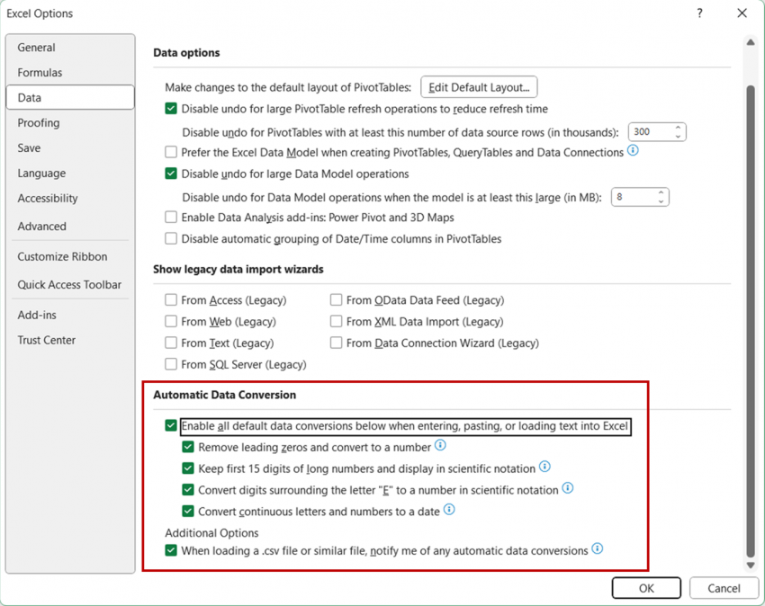 По поводу работы этой опции предусмотрены и некоторые нюансы. Например, отключение преобразования может повлиять на корректность вычислений при использовании формул в таблицах. Вдобавок отключение автоматического преобразования данных будет недоступным при использовании макросов.