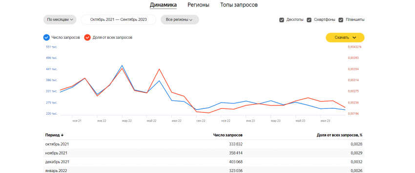 На начальной странице есть только поле для ввода поискового запроса. После того, как запрос будет задан, информация будет представлена в трех разделах: Динамика, Регионы и Топы запросов. Динамику можно посмотреть по месяцам, неделям или дням. Также данные можно выгрузить в формате таблицы CVS.