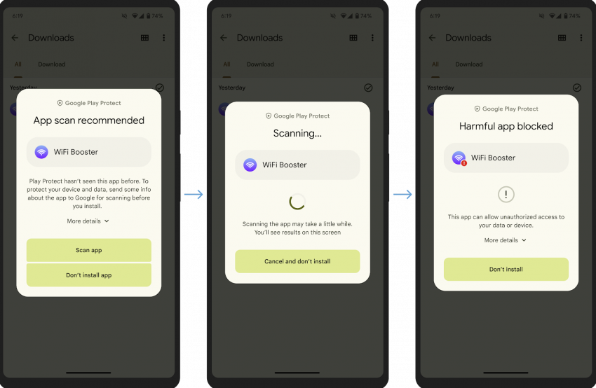 Компания Google улучшила защиту Play Protect для предварительного сканирования приложений перед их установкой. Ранее она работала на фоне и незаметно для пользователя. Недавно же был добавлен новый механизм, который проводит проверку в режиме реального времени и с глубоким анализом кода.
