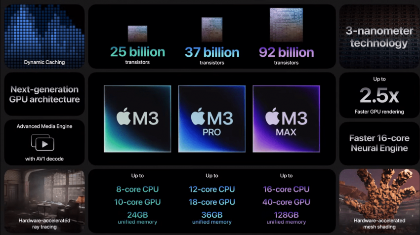 Новое поколение процессоров Silicon M3, M3 Pro и M3 Max выполнено по 3-нанометровому техпроцессу и получило поддержку аппаратной трассировки лучей. На Хабре пишут, что была реализована технология Dynamic Caching, позволяющая анализировать параметры GPU и выделять точный объем памяти под каждую задачу. Это, по мнению компании, поможет разработчикам лучше оптимизировать ПО на Mac.