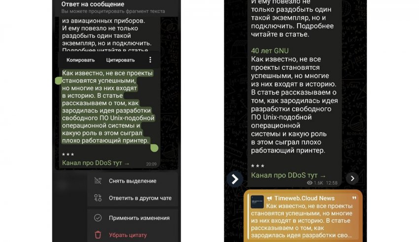 В ответах появилась возможность цитирования только определенного фрагмента сообщения собеседника. Чтобы процитировать такую часть, необходимо нажать на исходное сообщение (на iOS понадобится зажать сообщение пальцем), выделить конкретный фрагмент, а затем выбрать пункт «Цитировать». К тому же, такие части теперь будут подсвечиваться другим образом.