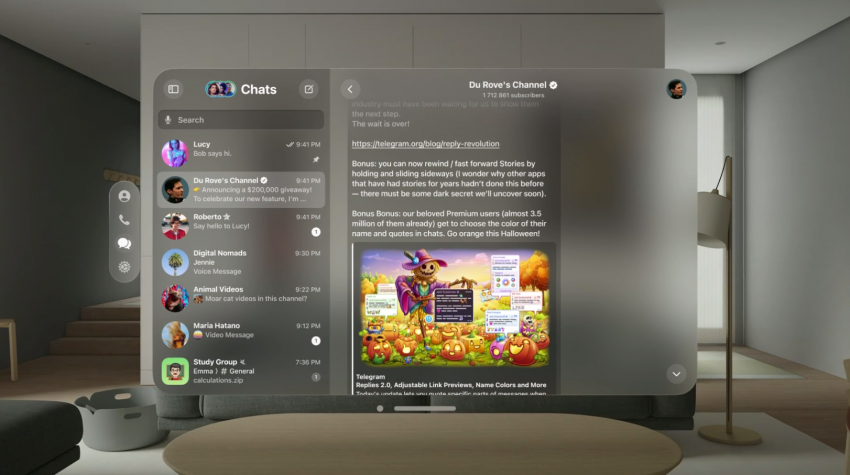 Основатель Telegram Павел Дуров на своем канале продемонстрировал, как будет выглядеть интерфейс приложения в дополненной реальности Apple Vision Pro. Дизайн его был разработан с учетом рекомендаций Apple.