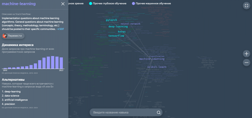 Навыки, расположенные рядом друг с другом, часто оказывались в одних и тех же поисковых запросах – они обладают близким контекстом использования. Наведя на конкретный тег, можно увидеть динамику интереса к нему с 2010 года, описание и перечень альтернативных навыков. Кроме того, при наведении на тег появятся линии, которые соединят его с десятью частыми «соседями». Среди популярных запросов – tensorflow, scikit-learn, machine-learning, image-processing, opencv.