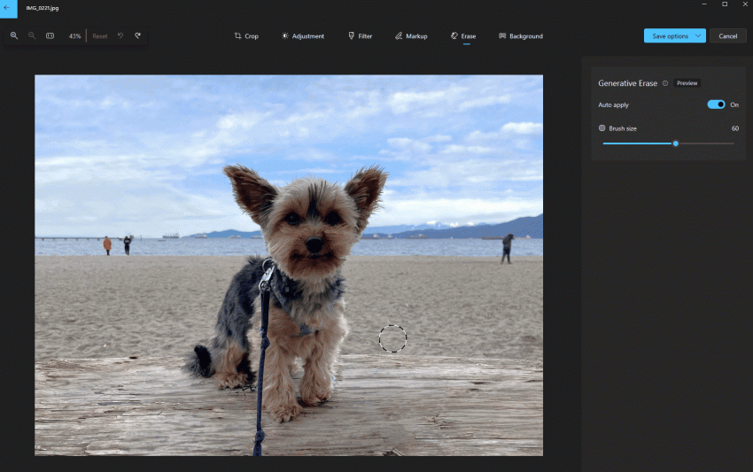 Функция Generative Erase работает на основе искусственного интеллекта. Пример ее работы был продемонстрирован на фото с собакой – разработчики убрали поводок и посторонних людей на заднем плане.