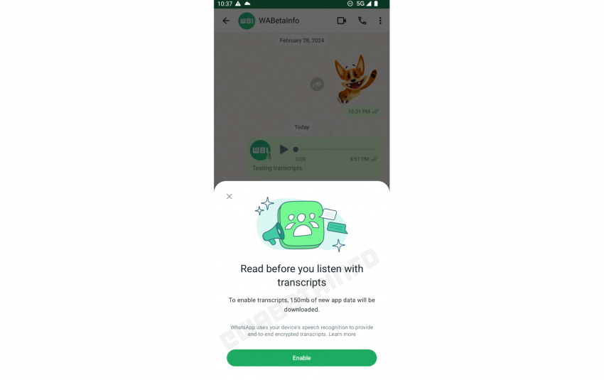 Чтобы запустить ее, нужно будет загрузить специальную программу распознавания речи – ее вес составляет порядка 150 Мб. На скриншоте, предоставленным WABetainfo, видно, что WhatsApp предлагает скачать данный модуль и включить расшифровку войсов.