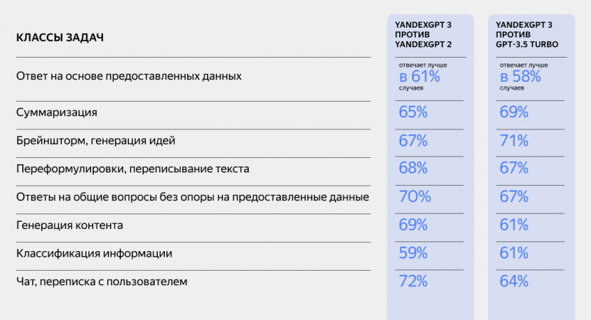 При проведении тестирования разработчики применяли методики YaMMLU_ru и Side by Side (SBS), а один из основных русскоязычных тестов создан на базе бенчмарка IFEval. SBS-сравнение качества работы языковых моделей с разными классами задач можно посмотреть на изображении ниже. В среднем, по данным Яндекса, YandexGPT 3 отвечает лучше YandexGPT 2 в 67% случаев.