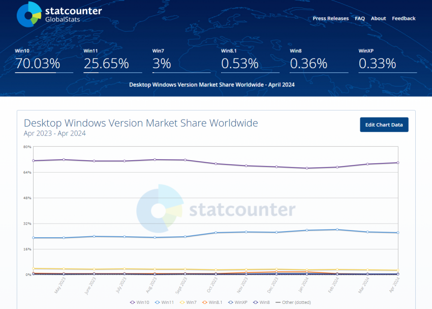 Судя по графику, пользователи переходят на Windows 10, поскольку система, которой скоро исполнится девять лет, прибавила 0,96 пункта и перешла отметку в 70% впервые с сентября 2023 года. Несмотря на то, что данные StatCounter не являются абсолютно точными, даже по этой статистике снижение в 3% для продукта с более чем 1 миллиардом устройств слишком значительно, чтобы его игнорировать.