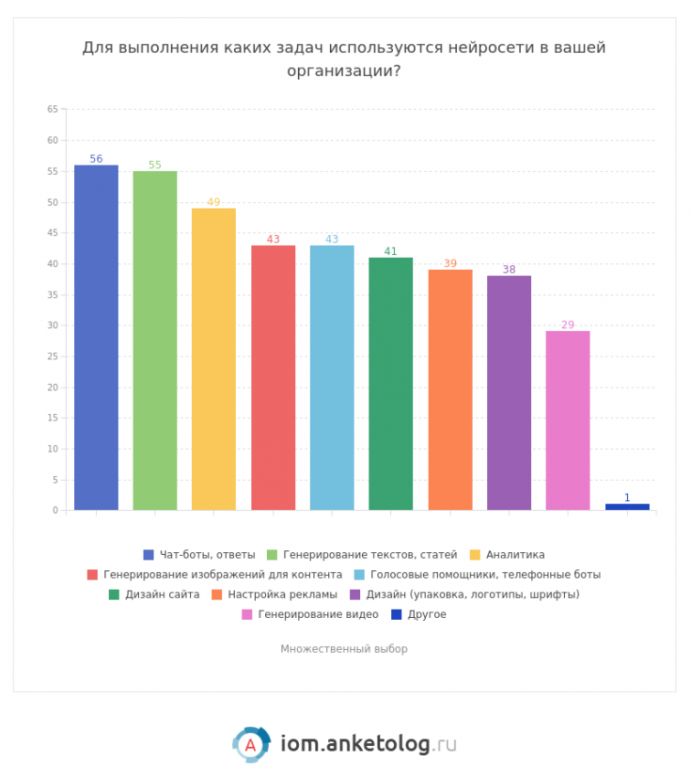 Сервис Анкетолог провел опрос среди более 700 руководителей, чьи сотрудники используют в работе технологии искусственного интеллекта. Целью опроса было выделение спектра задач, для решения которых в организации применяют нейросети, а также характера пользования этими сервисами.