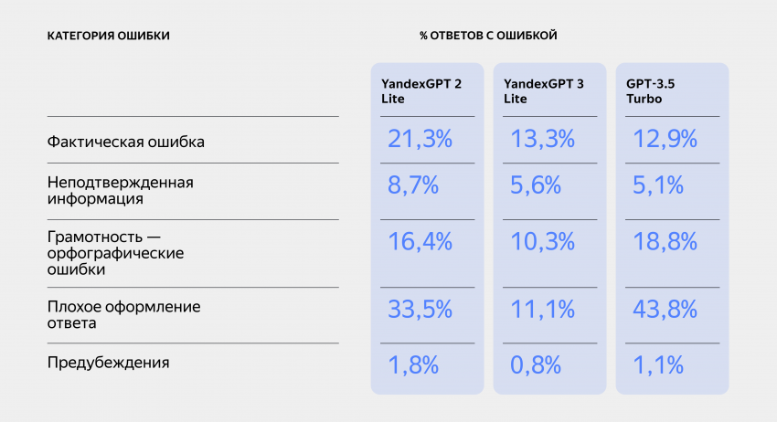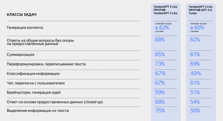 Сравнение по методике Side by Side с облегченной моделью предыдущего поколения YandexGPT 2 Lite и с конкурентом GPT-3.5 Turbo показало, что новая версия от Яндекса превосходит по количеству верных ответов (56% по сравнению с 50% от модели предыдущего поколения и 48% от нейросети от OnenAI). При вводе одних и тех же запросов обновленная модель давала лучше ответы в 68% случаев по оценкам экспертов.