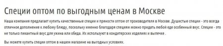 А вот ещё пример. Заходя на этот сайт клиент уже наверняка знает что ему нужно купить специи оптом в Москве и для чего они предназначены. Поэтому пользы от этого текста никакой нет. Ни к чему писать об очевидных вещах, да ещё и злоупотреблять ключевыми словами.