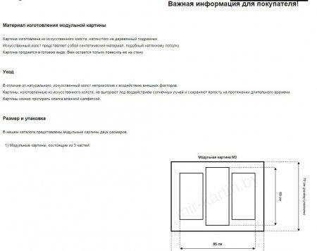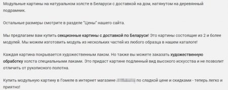 Ну и последний пример «зла и добра». С таким описанием становится лишь понятно, что можно купить секционные картины с доставкой по Беларуси, не более. После первых абзацев дальше читать уже не хочется, потому как текст писали для роботов, а не людей. Это зло: