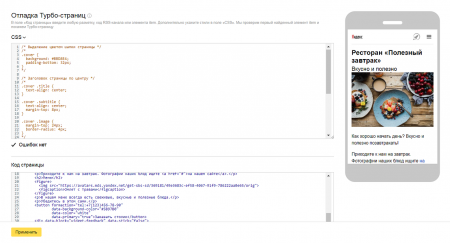 Кроме того, теперь полноценно работает и песочница, ранее представленная в бете. В интерфейсе инструмент называется «Отладка» — его можно найти в разделе «Турбо-страницы». Через него можно проверить и подобрать идеальный вид, соответствующий вашим ожиданиям ещё до того, как размещать созданные страницы в поиске: работайте и с RSS-фидом, и с его стилями.
