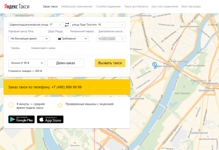 Если пользователь смотрит сайт с компьютера или планшета и нажимает на виджет — открывается сайт Яндекс.Такси с формой заказа. В поле «куда» уже указан адрес организации, вводить его самостоятельно не нужно. Сайт также постарается заполнить поле «откуда» — если у него получится определить, где находится пользователь. Останется только нажать «Вызвать».