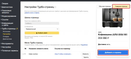 Чтобы проверить правильность настройки корзины, обязательно перейдите по кнопке добавления товара в корзину из превью, которое расположено в правом верхнем углу раздела настроек Турбо-страниц в Вебмастере. Если при переходе по кнопке товар в корзину добавился, и перед вами открылась та же страница, которая должна была открыться перед пользователям в случае добавления товара через сайт, то все хорошо. Если товар в корзину добавлен не был, то настройка корзины была произведена некорректно из-за неверно заданного URL. В этом случае нужно уточнить URL корзины. Обратите внимание, что URL корзины задается параметрически, просто перейти на страницу корзины и скопировать из браузера URL недостаточно для правильной передачи параметров