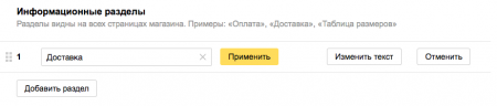 Если вам нужно указать доставку или другую справочную информацию — воспользуйтесь блоком «Информационные разделы». Просто добавьте туда нужное описание, и оно будет на всех Турбо-страницах вашего интернет-магазина. Эта и другие настройки для Турбо-страниц интернет-магазина появляется только после добавления YML в Вебмастер. До тех пор доступны только настройки для RSS.