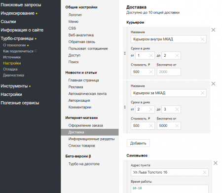 Магазины могут задать несколько видов доставки для Турбо-корзины в Вебмастере: курьерская доставка, пункты самовывоза и почта. Владельцы магазинов сами определяют стоимость и сроки доставки, а также указывают время работы пунктов самовывоза. Для каждого вида доставки можно добавить несколько вариантов (например, курьерская доставка по Москве, курьерская доставка по Московской области и т. д.) или несколько пунктов самовывоза.