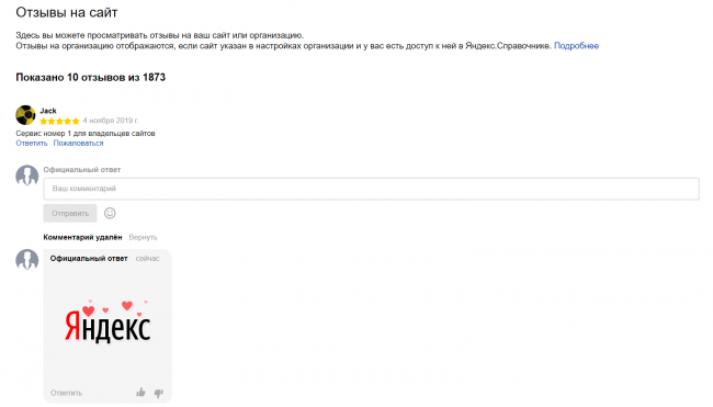 В случае если отзыв неконструктивен, владелец сайта сможет пожаловаться на него. Отзыв уходит на проверку и по ее итогам может быть удален. Пожаловаться на отзыв как владелец сайта можно прямо на странице отзывов в Вебмастере.