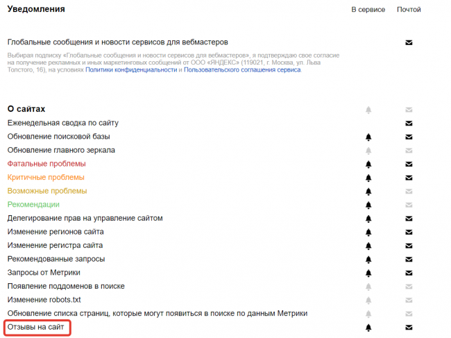 Каждый день роботы Вебмастера собирают сводку из новых отзывов с разделением на хорошие и плохие, а также примерами отзывов. Такая статистика будет приходить вам на почту: это позволит держать руку на пульсе и следить за динамикой отношения пользователей к вашему сайту. Письма будут генерироваться автоматически и приходить всем пользователям, подтвердившим права на сайт в Вебмастере. Если вы не хотите получать сводку по отзывам, отписаться от рассылки можно здесь.