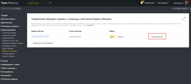 — Откройте раздел «Индексирование ? Обход по счётчикам». Посмотрите примеры страниц, которые могут попасть в поиск, если они доступны для вашего сайта. Нажмите кнопку «Примеры страниц» напротив счетчика, к которому вы привязали сайт.
