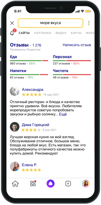 Выбирая организации — особенно кафе и рестораны — люди часто ориентируются по отзывам. Иногда этих отзывов очень много: сотни и даже тысячи. Чтобы люди могли быстрее принять решение, алгоритмы Яндекса теперь сами анализируют отзывы и показывают сводную оценку. На запрос о кафе или ресторане поиск покажет, как посетители оценивают его по разным параметрам: например, понравилась ли им кухня, персонал или музыка.