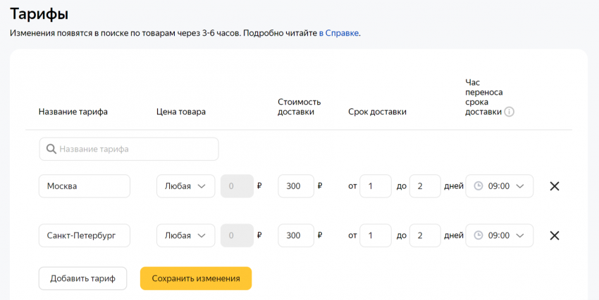 Перейдите в Вебмастер на страницу Товары и предложения → Источники данных, вкладка Доставка и настройте тарифы. Укажите сроки и стоимость доставки. Для каждого региона можно указать разные данные.2. Перейдите в раздел Товары и предложения → Источники данных, вкладка Фиды. Выберите конкретный фид и нажмите «Настроить» или на 3 точки справа и «Настройки доставки». Укажите график работы курьеров и нажмите «Сохранить».