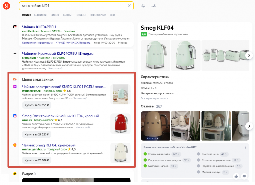 В одном месте внутри блока «Цены в магазинах» отображаются описание, изображение и цена товара. Это изменение позволит увеличить число заказов для интернет-магазинов по запросам на конкретный товар.