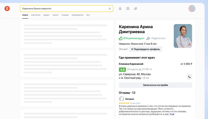 В поисковой выдаче есть специальный блок с врачами. Вот как это устроено: когда пользователь вводит специальность врача и город (а также можно указать район), появляется тематический блок с карточками специалистов.