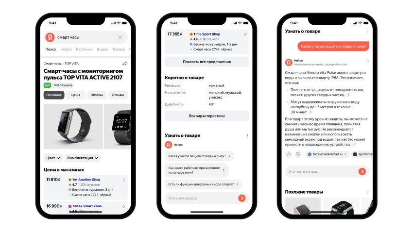 Теперь в базе Поиска есть информация о 2,7 миллиардах товарных предложений от интернет-магазинов. Когда пользователь ищет в Поиске какой-нибудь товар, он сразу может увидеть в поисковой выдаче его стоимость и изображения, выбрать подходящий вариант и перейти на сайт магазина. Также Поиск научился лучше определять, когда пользователь приходит, чтобы выбрать и купить товар, и предсказывает, совершит ли человек покупку на том или другом сайте.
