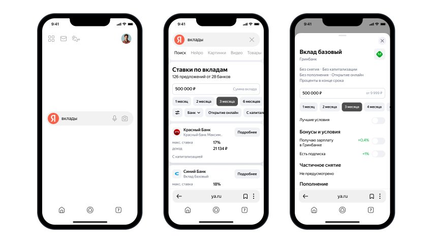 Поиск Яндекса поможет пользователям найти самые выгодные и подходящие вклады, выяснить условия ипотеки, а также выбрать дебетовую карту с лучшими условиями. Теперь при запросе на финансовую тему (например, «вклады с высокими ставками») в результатах Поиска появится тематический блок с предложениями разных банков. Финансовые организации могут попасть в этот блок, передав данные о своих товарах и услугах в Вебмастер.
